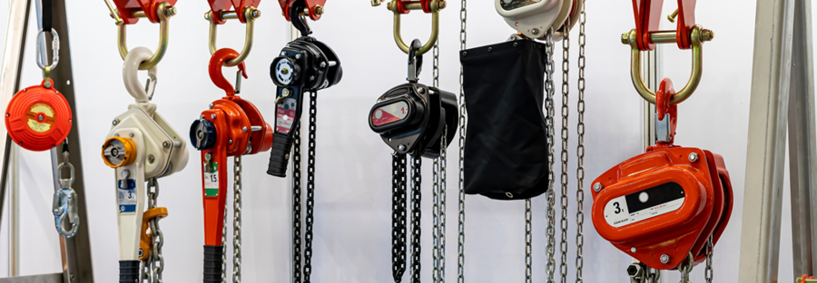 Présentation de l'ensemble des accessoires de levage comme les élingues (textiles, à chaine et à cables), les manilles et les palans.